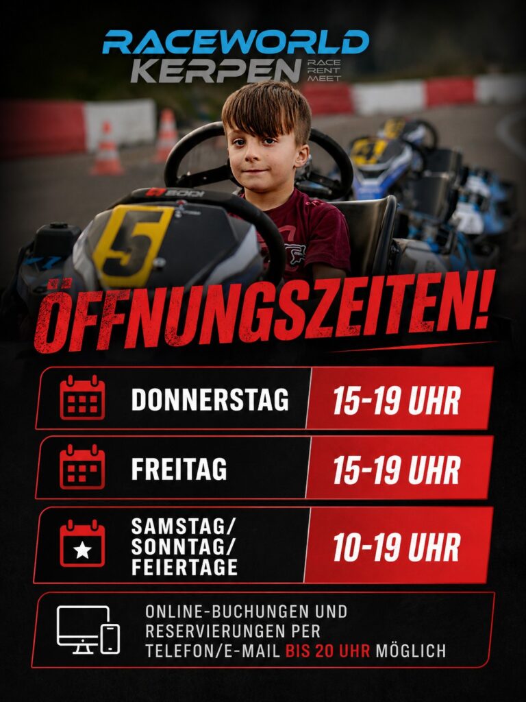 Ab sofort sind wir mit angepassten Öffnungszeiten für euch da – damit ihr noch flexibler eure Runden drehen könnt. Egal ob Feierabend-Race, Wochenend-Action oder spontaner Adrenalinkick: Bei uns findet ihr den perfekten Zeitpunkt für euer nächstes Rennen.